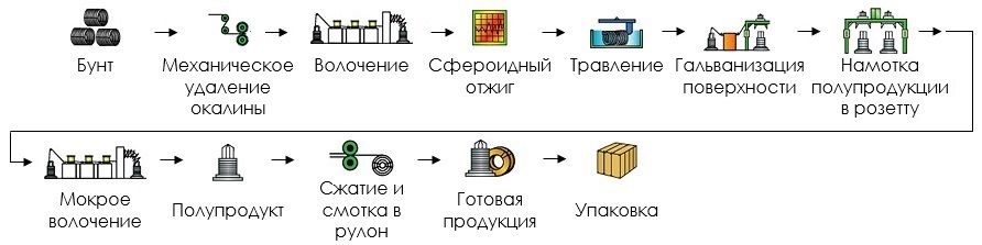 Процесс подготовки калиброванной проволоки под высадку крепежа, метизов, специальных деталей, для изготовления проволочной продукции включает ряд классических операций, которые повторяются от одного до трёх раз в зависимости от заказанного диаметра проволоки: