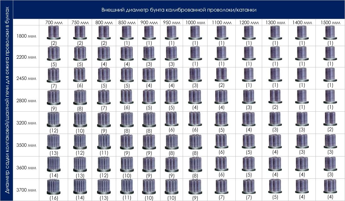 Количество бунтов проволоки в садке печи в зависимости от наружнего диаметра бунтового проката и размеров садки печи отжига