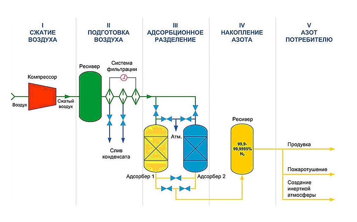 Генераторы азота работают по принципу PSA — Pressure Swing Adsorption (короткоцикловой безнагревной адсорбции). Основу генераторов составляет набор стальных адсорберов, заполненных специальным адсорбентом — углеродным молекулярным ситом. Этот специально подготовленный материал обладает порами таких размеров, которые преимущественно поглощают (адсорбируют) кислород, позволяя проходящему через адсорбер воздуху обогащаться азотом. Предварительно прошедший осушение и очистку сжатый воздух поступает в генератор и проходит через адсорберы снизу вверх. Молекулы азота, слабо проникающие в поры адсорбента, проходят через адсорбер и поступают в продуктовую линию, а кислород накапливается в адсорбенте. Емкость адсорбента по поглощению кислорода ограничена, поэтому генераторы автоматически переключают режим работы адсорберов — одна группа адсорберов работает на поглощение кислорода, вторая — регенерируется. Во время регенерации давление в адсорбере понижается и накопленный кислород выпускается в атмосферу. Адсорберы циклически переключаются, обеспечивая непрерывную выработку азота в течение 15-30 минут.