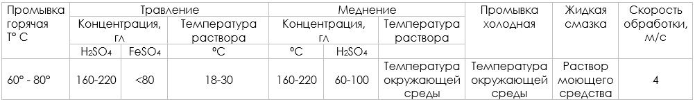 Установка скоростного меднения состоит из: размоточного устройства (с катушки или с мотка); промывочной ванны с горячей водой; ванны химического травления; ванны химического меднения; ванны холодной промывки; ванны для нанесения жидкой смазки и калибровки; намоточного устройства (на катушку). Для погружения проволоки в технологические растворы на установке использованы роликовые системы. Схемы заправки этих систем проволокой позволяют варьировать время обработки на каждой технологической операции. Омедненная проволока испытывается в ЦЗЛ в соответствии с требованиями НТД и принимается ОТК.