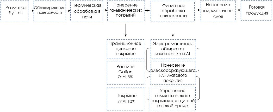Процесс является уникальным по технологии и позволяет одновременно наносить 3х вида гальванического покрытия на проволоку на одной технологической линии оборудования - покрытие Galfan 5%, покрытие алюминий-цинк 10% наряду с традиционным цинковым покрытием. После нагрева, который необходим для придания проволоки характеристик долговечности и прочности, проволока подается в одни из трех каналов на той же производственной линии. Процесс начинается с резервуара охлаждения, где проволока охлаждается до поступления в цинковую ванну, создавая нулевое или минимальное тепловыделение, необходимое для функционирования гальванической линии. Проволока проходит через цинк в наклонном положении, до тех пор, пока не соприкоснется с направляющей колодкой, где происходит изменение траектории проволоки в вертикальном положении перед входом в узел чистовой обработки поверхности. Экологически чистая газовая атмосфера предотвращает сталь воздействию воздуха в течение процесса гальванизации, тем самым, исключая использование вредных химических веществ и кислот в процессе производства. После гальванизации готовая продукция подвергается финишной обработке и нанесению подсмазочного защитного слоя, охлаждению. Современный технологический процесс в защитной атмосфере позволяет получать чистую готовую продукцию без окалины. Оборудование занимает меньше рабочего пространства в отличие от традиционных производственных линий.