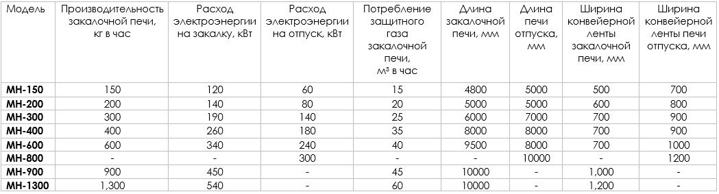 - Конвейерная печь для закалки/отпуска метизной продукции обеспечивают повышенную надежность в эксплуатации, высокую производительность, энергосбережение, качество продукции с высокими экологическими требованиями. Проектирование печи произведено с привлечением технологии Японии и Тайваня, что обеспечивает производительность макс. до 2000 кг/час.