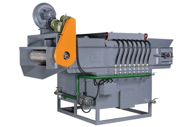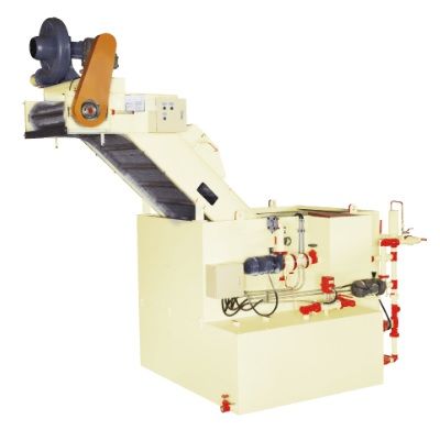 Магнитный конвейер предназначен для передачи изделий в узел обезжиривания и мойки, обеспечивает равномерное рассеивание изделий перед подачей в закалочную печь, оснащен системой автоматической подачи, независимой панелью управления с электрическим шкафом. Емкость загрузочного бункера составляет до 600 кг/час. Подъемный опрокидывающий механизм оборудован гидроцилиндром. Для удобства имеется взвешивающее устройство. Конвейер подачи с лентой из PV, скорость контролируется инвертором. Ширина конвейерной ленты: 900 мм. Скорость ленты конвейера: макс. 10,000 мм/мин. Электрическая мощность двигателя: 380В х 50Гц х 3 фазы х 1 л.с.