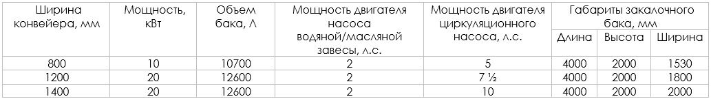 Закалочный бак онащен высокоэффективным теплообменником для охлаждения и быстрой регулировки температуры масла (воды). Температура масла поддерживается на уровне 60-80 ° С. Установленный в резервуаре фильтр предотвращает накопление стружки и частици, максимизирует эффект охлаждения. Фильтр легко чистить и заменять. Объем закалочного масла: 24,300 литров. Закалочное масло - Термойл-16 (GAZPROMNEFT). Размер: 2,200 (Ш) х 4,800 (Д) х 2,500 (В) мм. Конвейерная лента: 1,200 мм (Ш). Масляной двигатель и система циркуляции закалочного масла мощностью 380В х 50 Гц х 3 фазы х 5 л.с. х 2 шт. Двигатель системы масляного охлаждения с водяным теплообменником мощностью 380В х 50 Гц х 3 фазы х 5 л.с. Система автоматического контроля температуры закалочного масла и системы охлаждения с датчиками оповещения о неисправностях. Мощность воздуходувки: 380В х 50 Гц х 3 фазы х 3 л.с. Мощность двигателя конвейерной ленты: 380В х 50 Гц х 3 фазы х 60 кВт.