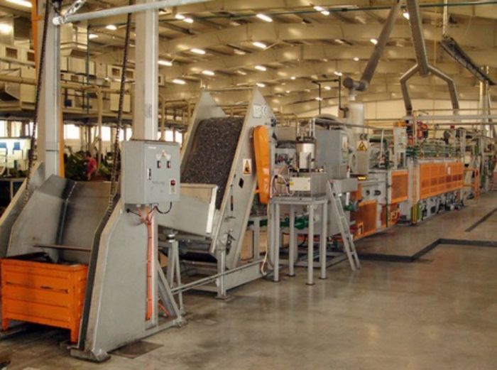 Изделия после штамповки в контейнерах заказчика поступают к загрузочному устройству. Загрузка изделий - регулируемая, упорядоченная, с равномерным распределением на магнитном конвейере, с использованием подъемно-опрокидывающего устройства. Количество загружаемых изделий регулируется с помощью компьютерной системы, чем обеспечивается необходимая толщина их слоя на конвейерной ленте печи. Постоянная производительность, равномерное перемещение изделий обеспечивается дозировкой и взвешиванием. Загрузочный бункер с запорной заслонкой и вибраторными лотками, включая жаростойкий печной желоб. Максимальная загрузка бункера – 600 кг. Перед термообработкой поверхность изделий подвергается очистке от остатков смазки, подсмазочного (фосфатного) слоя в предварительной моечной машине. Предварительная моечная машина, включающая обезжиривание, дефосфатирование, двойную промыку, сушку изделий - конвейерная, с электро нагревом. После промывки изделия направляются в печь нагрева под закалку с проволочной конвейерной лентой. Печь поставляется с газовым/электрическим нагревом. Лента целиком расположена во внутреннем пространстве печи. Максимальная температура печи - до 920 ºС. Химико-термическая обработка самонарезающих винтов осуществляется в среде защитного газа – эндогаза с применением добавочных газов – аммиака и природного газа. Нагрев под закалку крепежных изделий – болтов, гаек осуществляется в среде защитного газа – зндогаза. В качестве добавочного газа используется природный газ. Газоплотная кладка позволяет вводить в рабочее пространство контролируемую защитную атмосферу - эндогаз. Эндогазовая атмосфера производится на эндогазовой установке путем сжигания природного газа и воздуха с коэффициентом расхода воздуха около 0,25. Измерение, контроль и регулирование углеродного потенциала атмосферы по зонам печи осуществляется автоматически. Печь нагрева под закалку разделена на 4 зоны. Равномерное распределение в рабочем пространстве печи температуры (± 5℃) и среды обеспечивают 4-и вентилятора. Температура, состав печной атмосферы автоматически контролируются и регулируются во всех зонах печи. С конвейерной ленты печи изделия падают в закалочную ванну. Так как печь работает с защитной атмосферой, предусмотрена жидкостная пламенная завеса, исключающая попадание брызг и конденсата закалочной жидкости в рабочее пространство печи. Предусмотрен нагрев, охлаждение, регулировка температуры закалочной среды. Регулировка осуществляется посредством нагревателей и теплообменника. Выгрузка изделий из закалочного бака – посредством конвейерной ленты. После закалки изделия поступают в заднюю моечную машину, где удаляются остатки закалочной среды – закалочного масла. Промежуточная моечная машина, включающая обезжиривание, промыку, сушку изделий - конвейерная, с электронагревом. Из моечной машины изделия транспортируются в печь отпуска. Печь отпуска – газоплотная, с проволочным конвейером. Отпуск осуществляется в среде защитного газа. Печь поставляется с газовым нагревом. Лента целиком расположена во внутреннем пространстве печи. Максимальная температура печи отпуска –650 ºС. Отпускная печь разделена на 4 зоны, оснащена 4-я вентиляторами для выравнивания температуры и защитной среды. Из отпускной печи изделия 