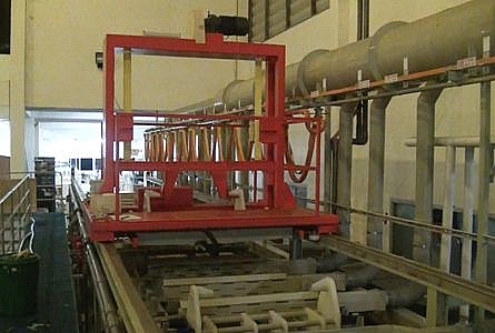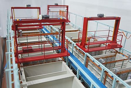 Наклонное основание ванн V-формы для слива растворов и система слива. Медное основание ванн V-формы для ванны электролиза и хромирования. Впускные и отводящие трубы с запорно-регулирующей арматурой изготовлены из полипропилена. Подача воды: основная труба 2'', патрубок 3/4''. Проводники в ваннах 10tx80W, медные пластины для электролиза 10tx80W, соединяющие медные пластины 10tx80W, медные пластины для электролиза 10tx60W. Лотки для укладки кабеля. Металлоконструкции.