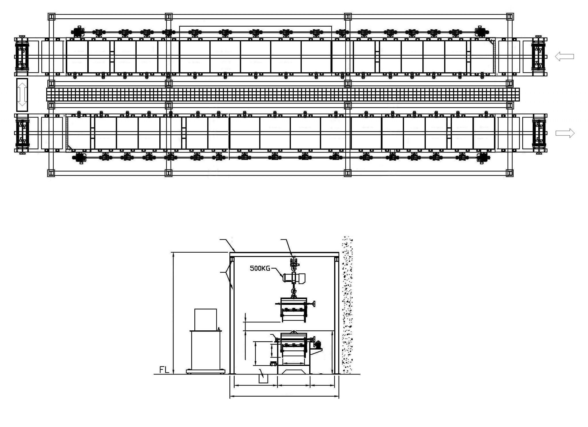 Выполнен из стали квадратного сечения марки SUS304 80*80. Рельсы SUS304 80*80, покрытые пластинами из SUS304 4t. Линия оборудования устанавливается на площади 24000х15000х6000 мм. Четырехрядная компоновка линии: технологические ванны -2 ряда, монтаж – 1 ряд, хранилище приспособлений – 1 ряд. Автоматическая подача смонтированных приспособлений. Платформа для технического обслуживания линии Оборудована ходовыми перфорированными настилами из полипропелена с пуклями, вдоль ванн. Свободный доступ для ремонта и обслуживания. Также имеются перилла для безопасности.