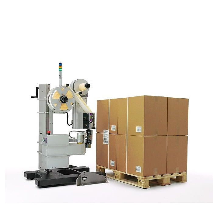 Данное этикетировочное оборудование предназначено для нанесения заранее определенных самоклеющихся этикеток из рулона сверху, сбоку и/или снизу на гофрокартонную коробку различных размеров. Для автоматического наклеивания этикеток используется дополнительный встроенный конвейер соответствующей конфигурации. Стандартное оснащение включает экран управления типа TOUCH SCREEN. Система управления может быть расширена дополнительно необходимыми функциями для оператора. Размер этикетки 100 х 80 мм. Принтер для печати на этикетках горячим способом типа GSC или обычный принтер с цифрами и буквами – описание продукта, логотипы, даты, код товара и прочие характеристики.