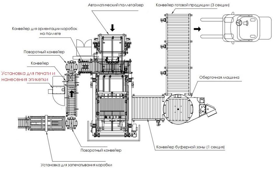 Установка для печати и нанесения этикетки оснащена конвейером для запечатывания и нанесения этикетки на коробку. Ленточный приводной конвейер установлен в линии сразу после фасовочного конвейера. Конвейер состоит из одной секции, длина которой составляет 1800 мм. Запечатанные коробки с конвейера подаются в узел нанесения этикетки и затем направляются на поворотный конвейер для ориентации коробок на паллет.