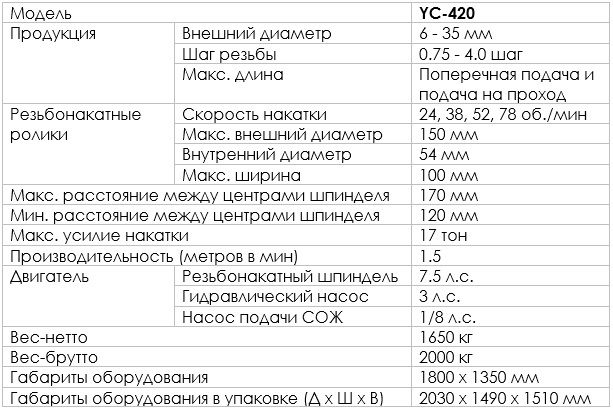 Стандартная комплектация представлена оборудованием для накатки резьбы гидравлического типа с поперечной подачей и подачей на проход. Насос подачи СОЖ 1/8 л.с. х 1 к-т. Гидравлический насос 3 л.с. х 1 к-т. Инструментальный ящик х 1 к-т. Руководство по эксплуатации х 1 к-т. Напряжение: 3Ф/50Гц/380В. Скорость: 24, 38, 52, 78 об./мин. Резьбонакатные ролики, стандартные Ø150 х Ø54 х 70 длина. Нож роликового типа 70 мм длина. Устройство подачи полуавтоматическое или устройство подачи автоматическое.