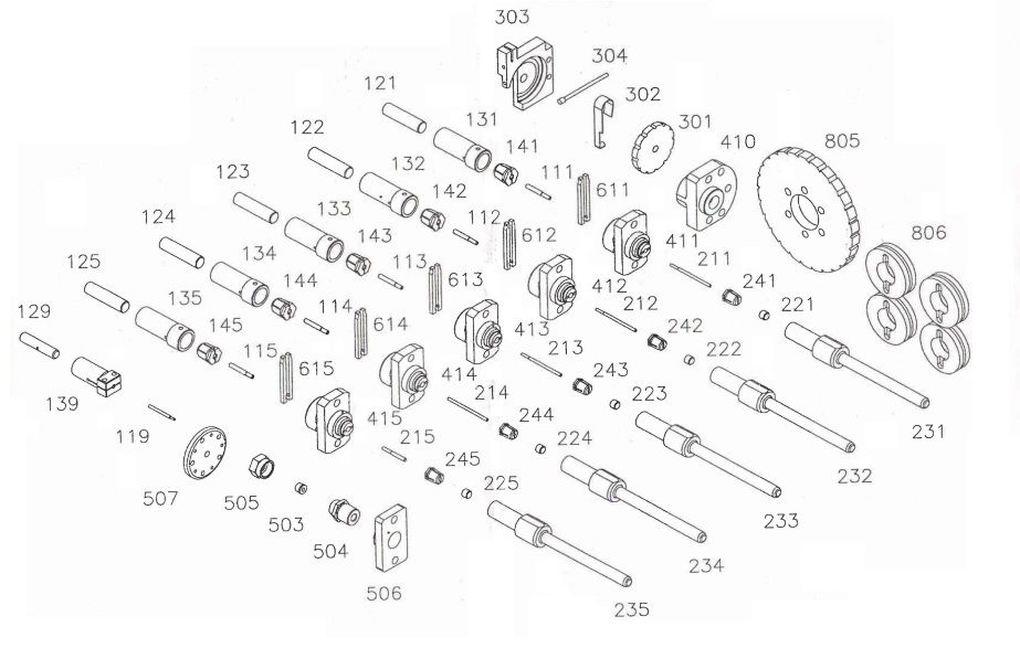 - Пуансонный блок - выталкиватели на каждой позиции пуансонов. Система возврата выталкивателя устройства снабжена пружиной, возвращающей выталкиватель назад после окончания цикла. Станина оснащена мерной шкалой для настройки механизма выталкивания. Регулировщик длины выталкивания с ручным управлением.