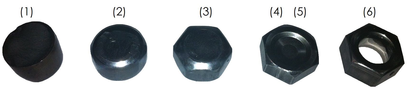 (1) подача металла и отрезка заготовки; (2) предварительная осадка; (3) предварительная высадка шестигранника; (4) предварительная высадка шестигранника и наметка отверстия; (5) окончательная высадка шестигранника и наметка отверстия; (6) прошивка отверстия. Отштампованная заготовка гайки поступает на промежуточный и далее в приемный бункер резьбонарезного станка. Из бункера заготовка по вертикальным направляющим падает в узел нарезки резьбы, где пневматический толкатель прижимает заготовку гайки к приводному вращающемуся метчику, проталкивая ее вдоль рабочей части стержня метчика, формируя внутреннюю резьбу. Готовые гайки сбрасываются с хвостовой части изогнутого метчика в контейнер для готовой продукции.