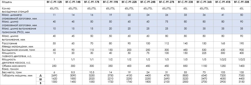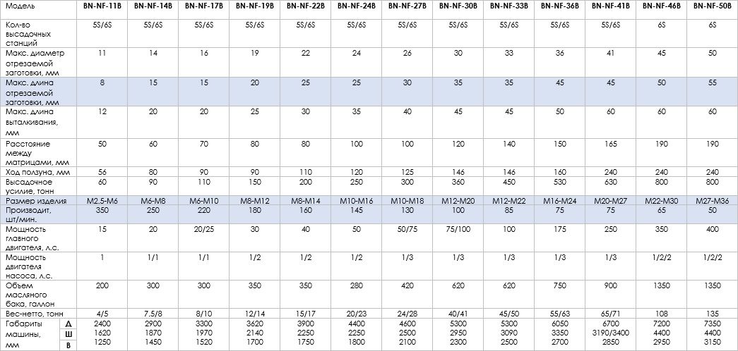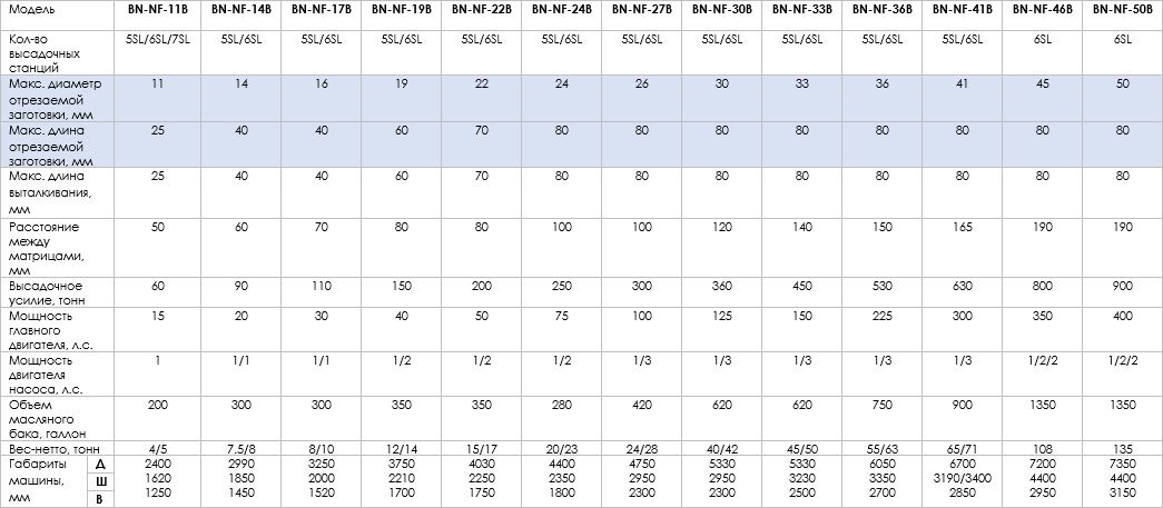 - Опция: инвертор, линейная система подачи заготовки, выталкиватель пуансонов (PKO), отрезной механизм закрытого типа, шумонепроницаемый кожух, монитор для инспекции нагрузок на высадочных станциях, подъёмный манипулятор для переналадки инструмента и оснастки, панель оператора HMI; модуль для быстрой смены отрезного модуля и ножа; модуль для быстрой смены матриц и пуансонов (QTC).