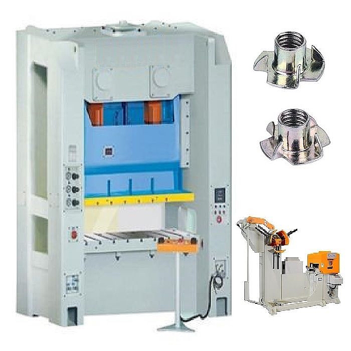 - Пресс предназначен для холодной штамповки усовой гайки DIN1624 из листовой стали толщиной 1.2 – 1.4 мм с программируемым прогрессивным штампом и станцией накатки резьбы в автоматическом режиме.