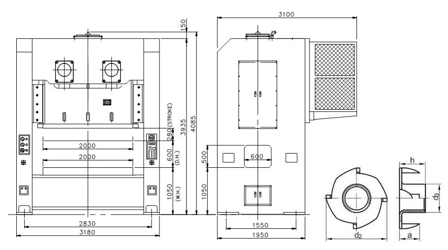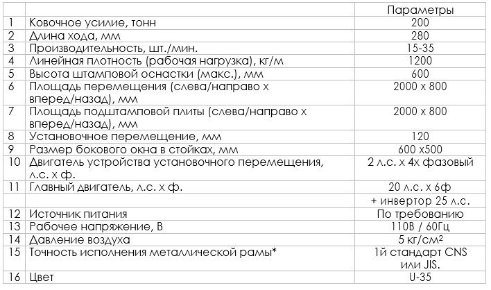 Пресс механический кривошипный с рамой H-формы укомплектован подштамповой плитой, высотой штамповой оснастки специального исполнения и инвертором мощностью 25 л.с. Литая рама Н-формы имеет прочную сварную конструкцию, прошедшую термический отпуск для снятия сварочных напряжений в конструкции. Положение привода: верхний привод (коленчатый вал, шестерни, шатун). Деформация 1:6000. Опциональное оборудование включает в себя фотоэлектрический датчик для обеспечения безопасности (ф. Komori, Япония), монтажную подставку, сменный инструмент, штамп с программируемым прогрессивным шагом и резьбонарезной станцией (2 в 1) для изготовления гайки усовой. Автоматизацию технологического процесса выполняет устройство автоматической размотки, правления и подачи штрипса (3 в 1) с ЧПУ и с серводвигателем. Ресурс инструмента и оснастки составляет более 1,000,000 ударов с возможностью повторного использования и замены расходных частей (пружин, матриц, пуансоов, выталкивателей) и компонентов.