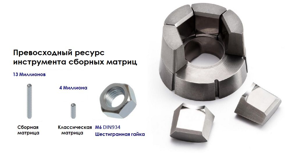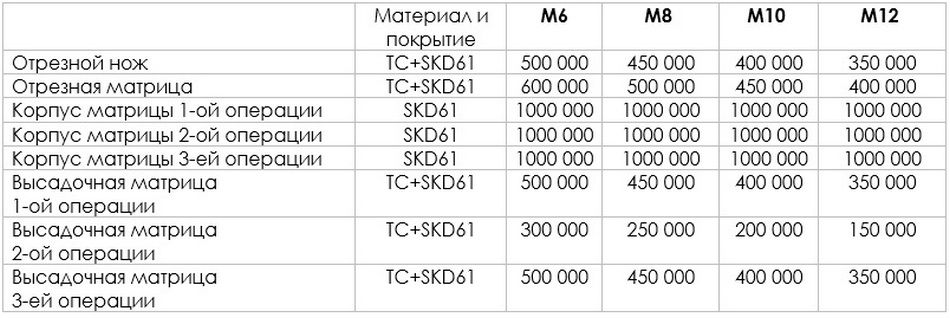 Превосходный ресурс и срок службы матрицы создает дополнительные ценности и способствует экономии на производстве. Например, для производства винта при референтных параметрах - диаметр М8 из легированной проволоки марки SCM435 средний срок службы обсечной матрицы составляет 60 000 ударов. Срок службы обсечной матрицы изготовленной из легкого сплава MD-4 для производства болтов, гаек и специальных деталей из нержавеющей стали составляет 40 000 ударов. Мы имеем возможность разрабатывать инструмент и оснастку согласно чертежам готовых изделий и технических требований (при этом необходимо уточнить размер посадочных мест для оснастки, модель используемых станков и диаметр проволоки, исползуемый для высадки крепежа, метизов и деталей).