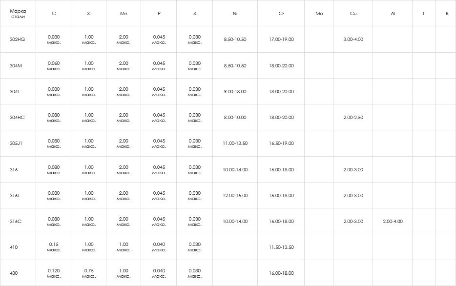 | Нержавеющая сталь, серия-316 | 538° | Металл не настолько прочен нежели нерж. стали серии-304, но более устойчив к коррозии в химических растворах (за исключением ограниченного диапазона оксидных кислот). |