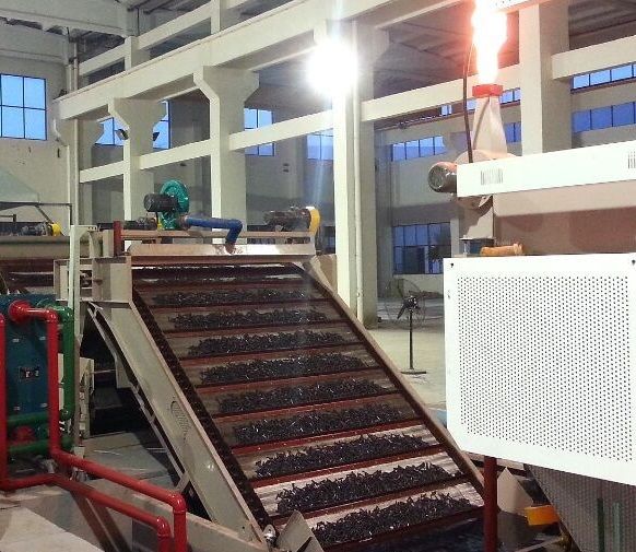 Конвейерная лента с плетёным проволочным конвейером идеально подходит для проходных агрегатов химико-термической обработки крепежа, метизов и специальных деталей. Оснастка устанавливает в печь таким образом, чтобы небольшая часть конвейера выходила за пределы печи. Это не влияет на потерю тепловой энергии, так как плетеный конвейер поглощает очень малое количество тепловой энергии. В тоже время, оператор имеет возможность анализировать состояние продукции и ее положение на конвейере перед подачей в закалочную печь. В процессе эксплуатации, происходит естественное удлинение конвейерной ленты. Специальное натяжное устройство с утяжелительной подвеской позволяет контролировать длину и натяжение ленты без необходимости подрезки конвейерной ленты по длине, что особенно сложно выполнить во время эксплуатации оснастки в результате малейшей термической деформации звеньев конвейера, которая имеет место и является естественным процессом старения оснастки. Огневая завеса на входе в закалочную печь полностью блокирует и исключает утечку защитной атмосферы из печи, предотвращает окисление продукции во время термической обработки.