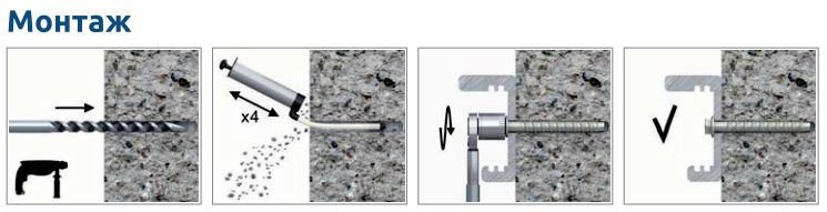 (1) Просверлить отверстие необходимого диаметра и глубины. (2) Очистить отверстие от буровой пыли и мусора (например, с использованием насоса). (3) Вставить болт в отверстие сквозь прикрепляемый элемент, докрутить его до достижения требуемой глубины анкеровки и затянуть. В качестве ориентира можно использовать рекомендуемый докручивающий элемент.