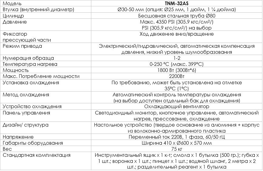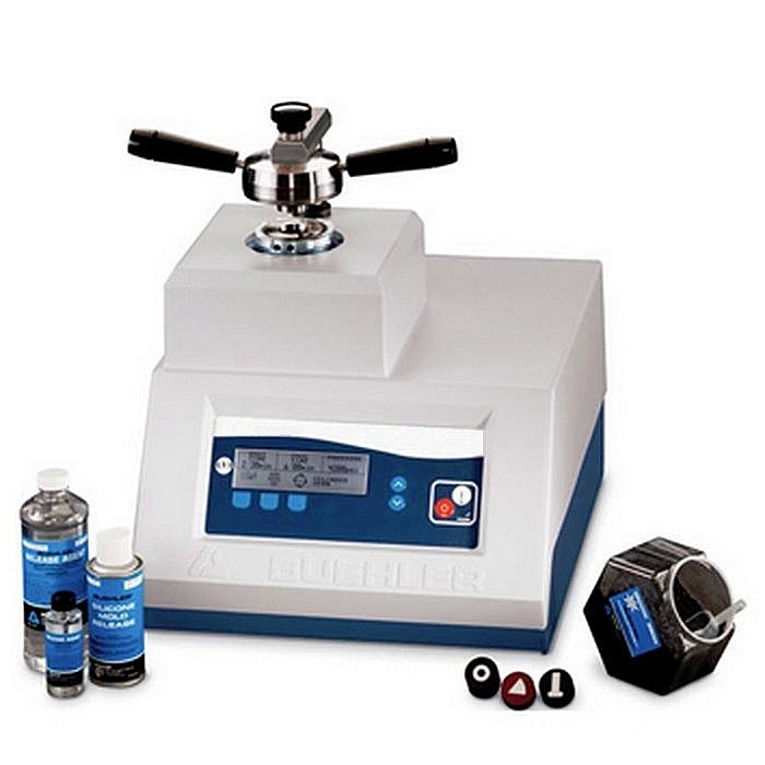 Пресс предназначен для фиксации металлографических образцов с помощью термопластичных и термореактивных полимеров: бакелита, эпоксидных и акриловых смол, и т. д. Отличается высокой надежностью и простотой эксплуатации. Имеет цифровой индикатор температуры, таймер и звуковое сигнальное устройство для удобного отображения параметров и контроля всех этапов процесса формовки. Все ответственные элементы запрессовочных станков выполнены из высокопрочной стали с повышенной устойчивостью к коррозии. Система водяного охлаждения позволяет эффективно отводить тепло из рабочей зоны. Подача воды для охлаждения пресс-формы осуществляется автоматически. Опционально имеется возможность запрессовки одновременно двух образцов благодаря специальной функции. Имеются формы 3 размеров. Стандартный размер формы в базовой комплектации составляет ᴓ 32,0 мм.