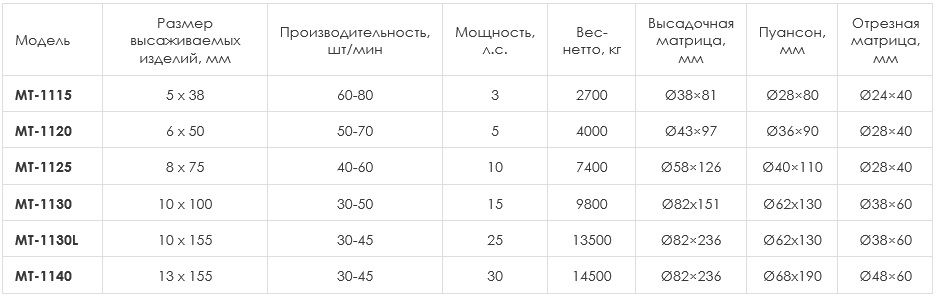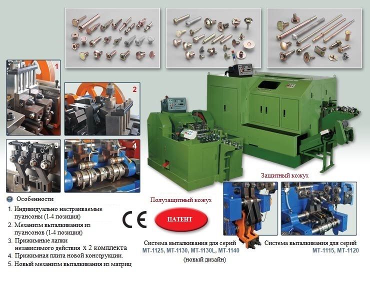 - 2-x позиционные, 4-х ударные холодновысадочные станки серии МТ способны высаживать детали различной сложности: от винтов и заклепок до шестигранных и фланцевых болтов и валов.