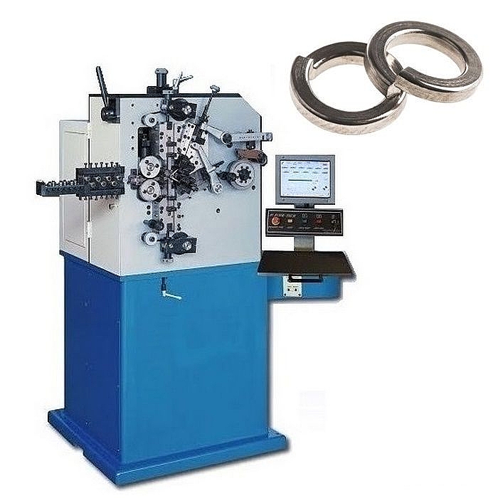 Оборудование обеспечивает полный технологический цикл производства пружинной шайбы, стандарт DIN 127, DIN 128A, DIN 128B, DIN 6913, DIN 7980. Производительность оборудования от 400 ед. в мин. (для шайбы с поперечным сечением 0.8*0.8 х 4.0*4.0 мм) до 800-1000 ед. в мин. (для шайбы с поперечным сечением 0.5*0.5 х 1.6*1.6 мм). Настройки оборудования и ПЛК позволяют получать точный угол равный 70 градусам, не требует применения дополнительного оборудования, что отличает данный автомат от классических моделей других производителей.