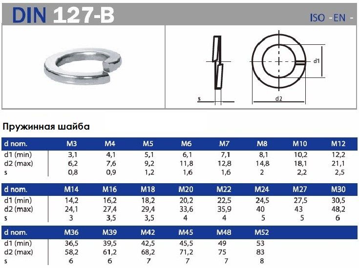Пружинные шайбы производятся по стандарту ГОСТ 21797-76 из стали марки 65Г, 70, 3Х13. Шайба пружинная или гровер – металлическая деталь различных механизмов и машин, выполненная в виде разрезанного кольца. Она является самой распространенной деталью, которая предотвращает саморазвинчивание резьбовых соединений. Для предотвращения раскручивания резьбовых соединений ее прокладывают между гайкой и поверхностью крепления. Шайба пружинная применятся в приборостроении, машиностроительной отрасли, автомобилестроении и других отраслях. Гровер представляет собой металлическую деталь в форме кольца, разрезанного под углом. Его изготавливают из закаленной или нержавеющей стали прямоугольного сечения. Концы этой детали имеют острые кромки и немного разведены в стороны. Во время монтажа гровер располагают между крепежной поверхностью и гайкой таким образом, чтобы во время закручивания острые края врезались в поверхность гайки, тем самым, обеспечивая надежное крепление. Шайба пружинная используется в тех соединениях, где необходимо обеспечить надежную фиксацию связанных элементов конструкции, которые подвержены сильным вибрационным нагрузкам.