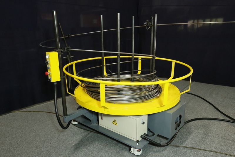 Дополнительное оборудованиек проволокогибу CHR-3A (поставляется в комплекте). Разматыватель раскручивает проволоку из бухты для подачи ее в проволокогиб. На нем установлен концевой датчик: при касании его проволокой, включается двигатель, который разматывает бухту на необходимое количество. Скорость, направление и сила натяжения проволоки регулируется и настраивается в соответствии с вашими требованиями.