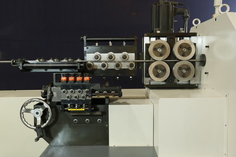 Оборудование для гибки проволоки и прутков имеет 3 сервопривода, которые отвечают за подачу, вращение головы и гибку проволоки. Для более удобного управления, станок оснащен ручным пультом, который позволяет управлять станком на расстоянии или непосредственно вблизи необходимой части машины. Перед гибкой, на гибочном станке установлен выравниватель проволоки. Проволока из бухты, попадая в этот механизм, выпрямляется и подается на гибку уже в ровном состоянии.