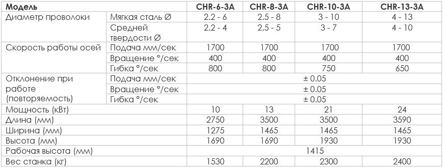 Станки оснащены 3 сервоприводами, выполняющими подачу проволоки, поворот в пространстве и гибку, что обеспечивает: высокую производительность, отсутствие шумов, максимально высокую точность гибки (± 0,05 °). Станки серии CHR также позволяют производить гибку проталкиванием - для изготовления спиралей, дуг и другие формы плавных кривых, а также больших радиусов от 6DR до ∞. В линейке представлены 4 типа машин. Основное различие между ними заключается в максимальном диаметре проволоки: