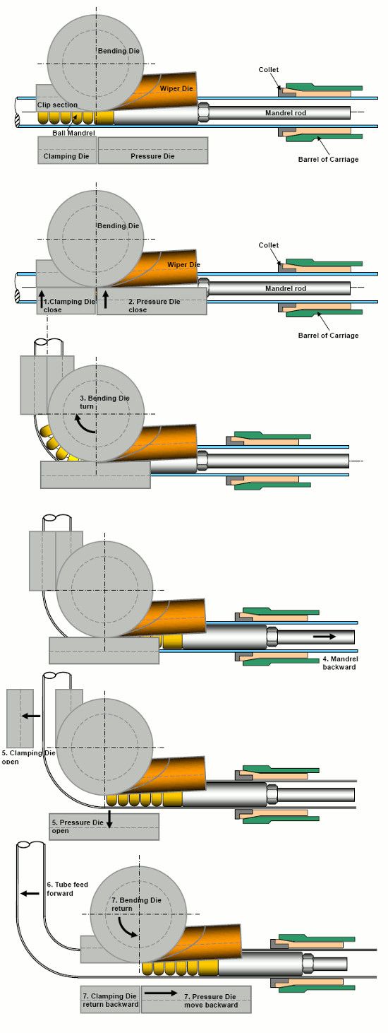 Процесс гибки на данном оборудовании называется гибканаматыванием, его принцип довольно прост: труба формируется в гибочной голове определенного радиуса, при этом один конец зажимается в прижимах и вращается вокруг собственной оси, наматывая трубу на гибочную голову. Для предотвращения появления гофры в месте гиба, используется дорн с кольцами, который находится внутри трубы в месте гиба. Дорн - это зачастую бронзовая (или стальная) оправка, точно подобранная по внутреннему диаметру трубы, которая во время гибки постоянно находится внутри трубы в месте гиба и не дает образовываться гофрам и складкам. Дорны бывают двух видов - шариковый (ball mandrel) и продолговатый (bulet).