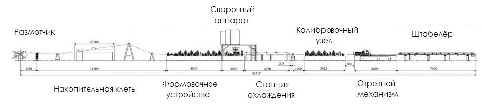 Принцип работы линии для производства стальных прямошовных электросварных труб: (1) гидравлический размотчик подает ленту (штрипс) к сварочному устройству; (2) материал ровно обрезается и сваривается встык, затем с помощью втягивающего устройства штрипс поступает в накопитель; (3) накопительная клеть предназначена для обеспечения бесперебойной работы линии. Для предотвращения спутывания штрипса ширина клети регулируется винтовой системой вручную; (4) после накопителя штрипс подается в формообразующее устройство, где происходит формирвание круглой заготовки трубы; (5) далеее происходит процесс сварки; (6) обрезка шва резаком; (7) охлаждение; (8) затем труба подается к калибрующей системе, там ей придается требуемая форма (квадратная, прямоугольная, либо окончательно выравнивается круглая); (9) передвижное отрезное устройство, "летающий резак", с ЧПУ, захватывает трубу и производит отрезку заданной длины; (10) готовая продукция подается на стол приема готовой продукции (штабелер); (11) далее продукция может быть упакована, промаркирована и складирована.