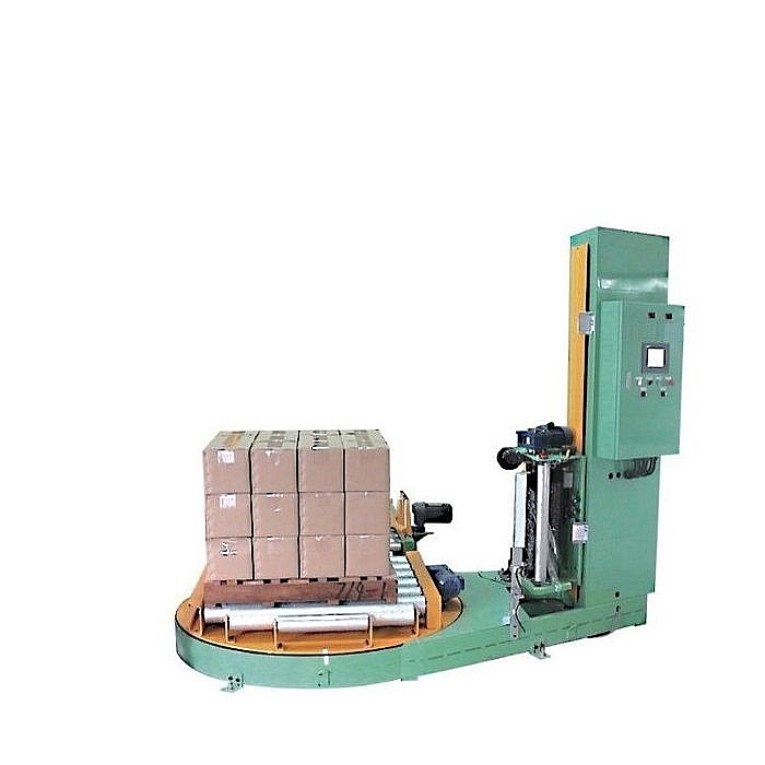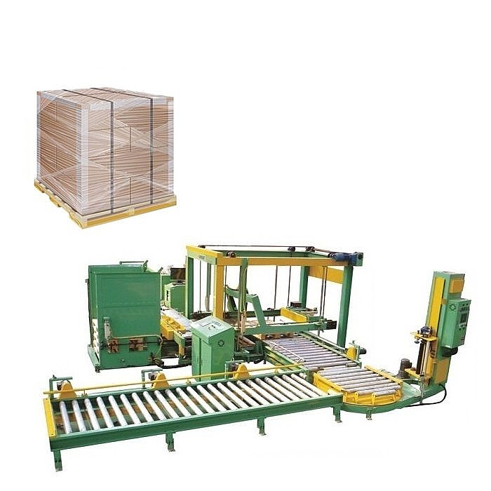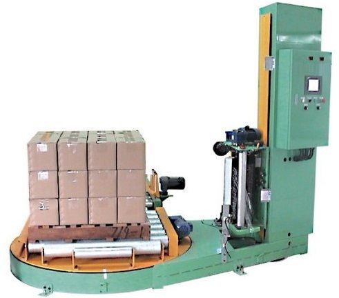 После окончания формирования паллета укомплектованный паллет автоматически выводится из зоны загрузочной станции, освобождая место для пустого паллета. Система вывода укомплектованного паллета синхронизирована с системой подачи пустого паллета. Автоматическая оберточная машина предназначена для обертывания-утяжки сформированного паллета стрейч-пленкой. Состоит из вращающейся приводной платформы и подвижного держателя рулона с пленкой. Оберточная машина имеет возможность регулировки натяжения и высоты наложения пленки, количества слоев (оборотов) пленки. Габариты паллетов - 1200х800 мм. Максимальная высота обертываемого паллета с коробками – 2000 мм. Грузоподъемность - 1200 кг. Ширина стрейч-пленки - 500 мм. На вращающейся платформе оберточной машины имеется приводной рольганг для удаления обернутого паллета на конвейер для временного хранения упакованной продукции.